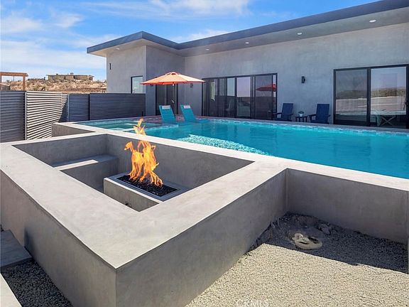 Experience the ultimate desert lifestyle in this brand-new modern home, perfectly designed for both relaxation and entertainment. Located in the highly sought-after Joshua Tree area, this property immediately impresses with its resort-style outdoor amenities—a private pickleball court, sparkling in-ground pool and spa, and an expansive sunken fire pit, all set against breathtaking desert and mountain views.