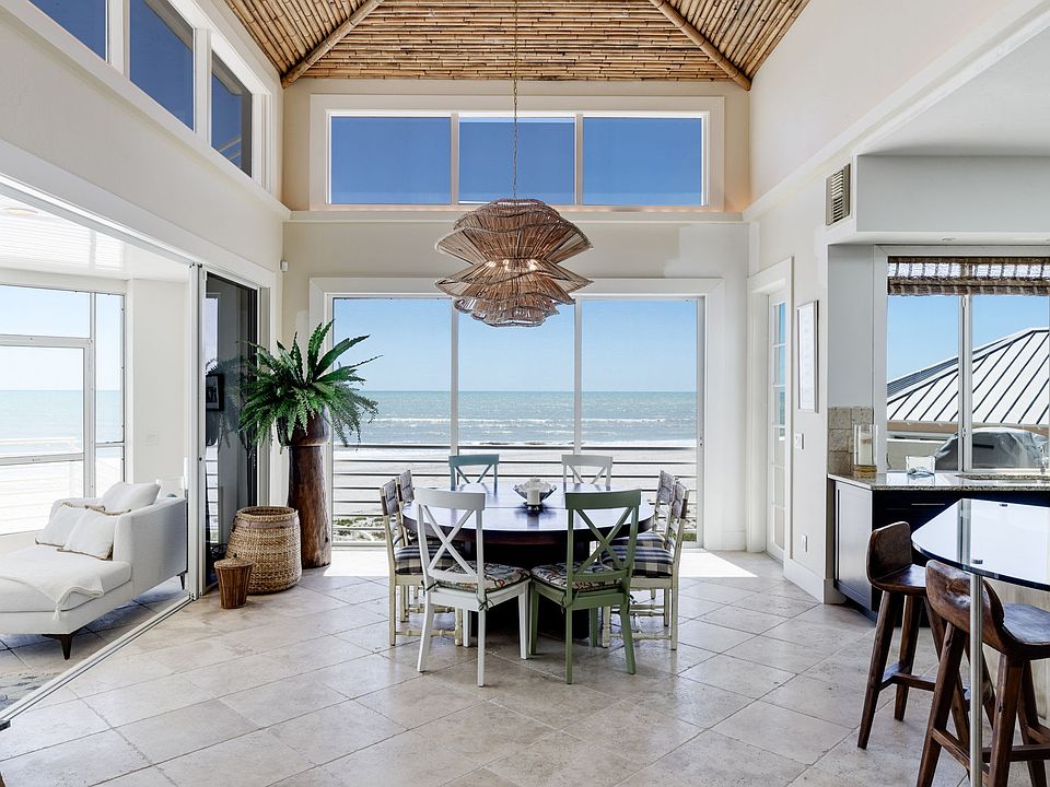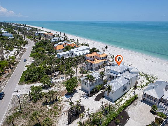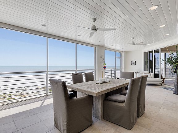 This beachfront home offers a blend of luxury and comfort across multiple living areas. The primary living space includes three bedrooms, featuring a primary bedroom with a king-sized bed, an en-suite bathroom with dual vanities, a walk-in shower, and a soaking tub. A spiral staircase leads to a sitting room/study with beach views. The open concept kitchen and living room extend to a beachfront lanai, ideal for enjoying coastal breezes. Two queen guest bedrooms each have en-suite bathrooms and walk-in showers for privacy and convenience.