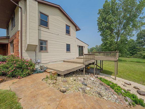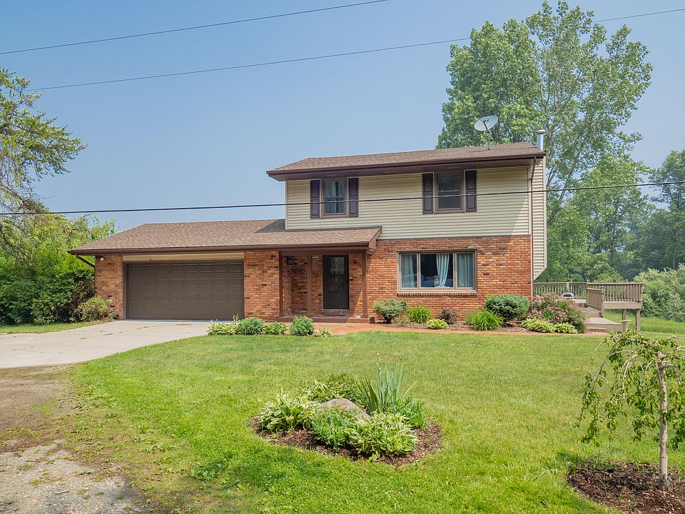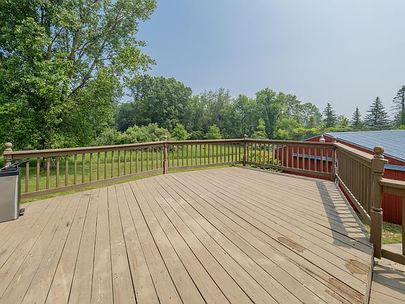 Updated 4 bedroom traditional with partially finished walkout lower level on 5 acres and a 40 x 24 pole barn. Wooded area at back of property. Tons of updates including: furnace and AC in 2017, water heater 2016, roof 2013, replacement doors, windows, new trimwork, new vinyl flooring upstairs, fresh paint, and new carpet throughout the home. Kitchen features granite counters, hardwood floors, stainless appliances and a pass through window into family room. Extra windows in family room provide scenic views of acreage and wildlife, with tons of light, complemented by a doorwall leading to tiered decking. 4th bedroom in walkout lower level. Fenced area in back for pets and terraced landscaped walkway from house to pole barn. Perfect for anyone looking for privacy and turn key living.