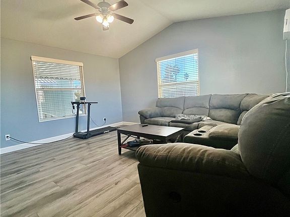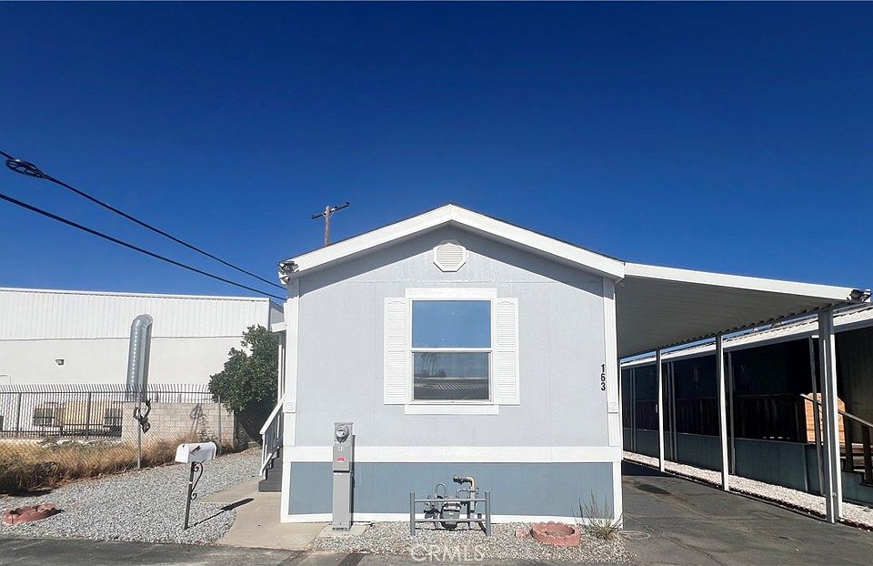 Welcome to Arroyo Fairways, a 55+ golf course community offering a peaceful, amenity-rich retirement lifestyle. This well-maintained home features a covered front entrance with stunning views of the Idyllwild Mountains, vaulted ceilings, tinted privacy windows on the neighbor's side, dual-pane windows with custom blinds throughout, central heating, newer interior paint and flooring, and a recently replaced hot water heater. The kitchen flows seamlessly into the dining area, while the spacious living room is filled with natural light from large picture windows that frame beautiful evening sunsets. The primary bedroom includes a wardrobe closet and ceiling fan, and the adjoining bathroom offers a step-in shower with built-in seating. The additional bedroom is generously sized, and the entire home features laminate wood flooring. Included with the home are a refrigerator, washer and dryer, two large flat-screen TVs, and a security camera system. Outside, you'll find a two-car covered carport, a large lot with fruit-bearing orange and avocado trees, and plenty of outdoor space to enjoy. Residents of Arroyo Fairways enjoy access to a clubhouse with a newly remodeled kitchen and TV room, billiards, covered shuffleboard courts, a swimming pool, a jacuzzi, and unlimited free golf—all set in a tranquil and scenic community perfect for embracing the retirement lifestyle.