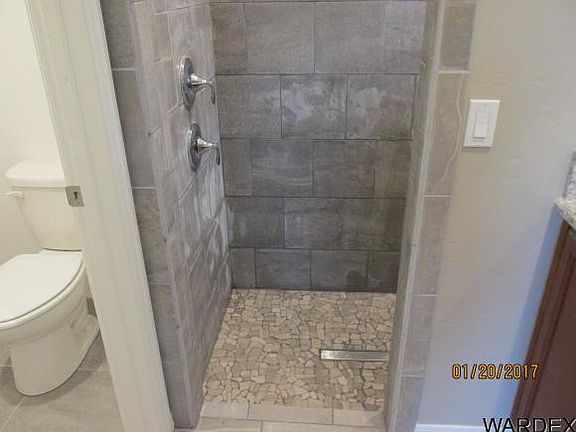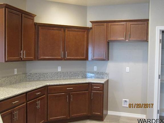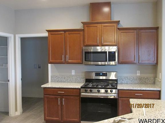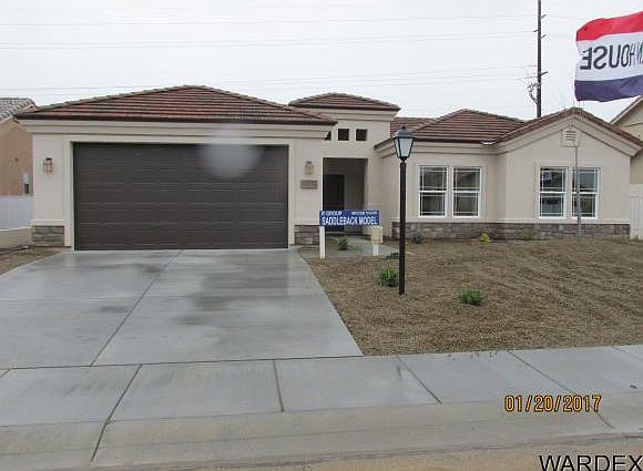 Beautiful BRAND NEW home! Fabulous new open floor plan. Big bathrooms throughout! Both with high vanities with double sinks and granite counters. Tile floors. Hall bathroom with porcelain tub with custom tile surround. Master with over sized step down custom tile shower with dual heads. Separate porcelain tub. Ample space provided in the master walk in closet. Spacious living room with high recessed ceiling. Gourmet kitchen equipped with stainless steel 5 burner gas stove, microwave and dishwasher. Beautiful maple cabinets with brushed nickle hardware. Walk in pantry. Boat deep garage stretching 30 feet in length. Great lot with a view of the Hualapai's with fully landscaped front and back yards with easy care rock and bubblers to all trees and bushes and painted block wall. This is a beautiful must see home. You will not be disappointed!