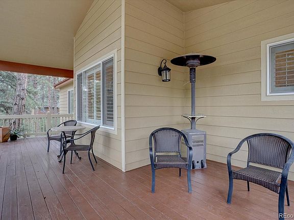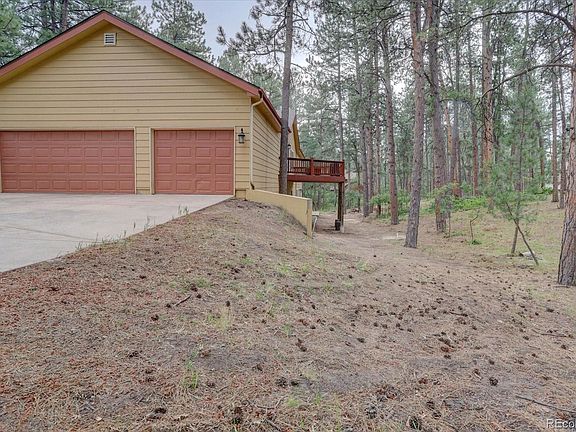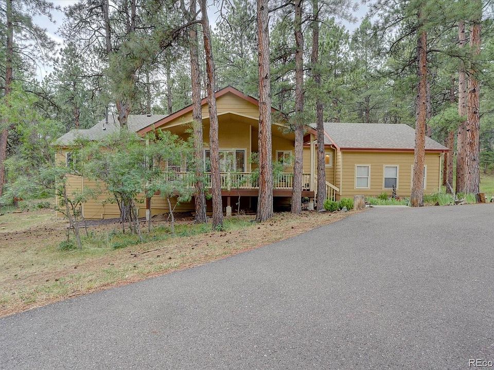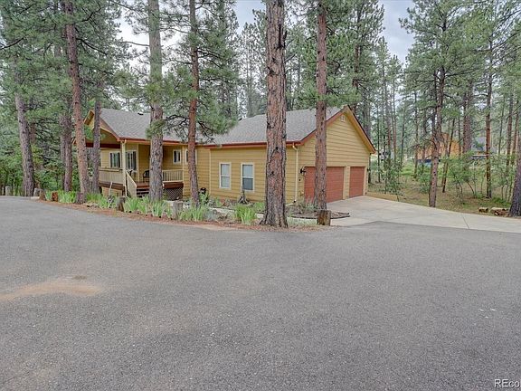 Rare Ranch style home in Larkspur’s Perry Park. Beautiful forest setting on nearly an acre of Ponderosa pine trees and low maintenance landscaping.  This 4 bedroom, 3.5 bath home has an open floorplan, but also offers spaces for those who work from home. The main floor includes a gourmet kitchen with oak cabinetry and beautiful Australian granite countertops, (oak floors refinished in 2021), dining room, living room, the primary bedroom with en suite bath, and another bedroom. The kitchen opens out to the back deck or the spacious front porch where you can enjoy morning coffee or evening happy hour. The walkout basement includes a workshop or craft room lined with countertops and cabinets, a hardwood library, two bedrooms, a full bath, and large family/play room. Garage is also lined with cabinets and countertops. Just a quick minute to Highway 105, 10 mins to I-25. An easy drive to the city from your oasis out of the city.