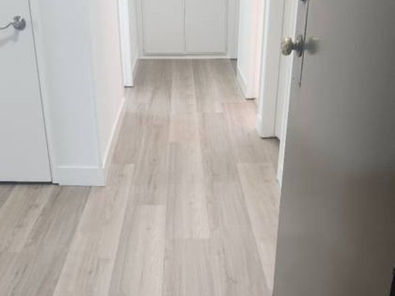 Laminate wood floors with porceline tile in kitchen and bathrooms.