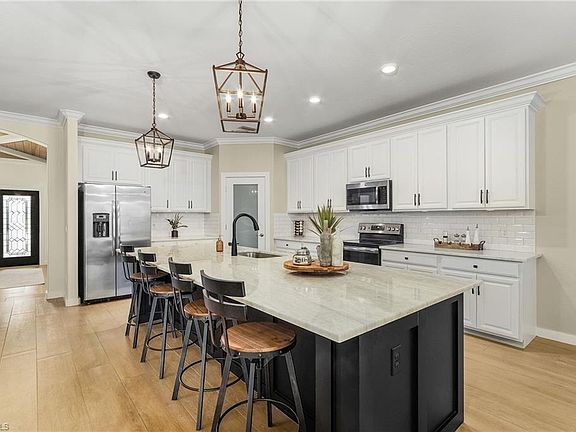 This amazing home in Raffia Preserve is Move-In-Ready and a Must- See! This 3 Bedroom plus Den, 3 Full Bath, 3 Car Garage Summerville II floor plan built in 2017 is situated on a premium oversized cul-de-sac lot with wrap-around lake and preserve views. The pie-shaped lot provides privacy from neighboring properties and there is plenty of room for a custom pool. Since its construction, the home has undergone significant upgrades, including luxurious Italian plank tile flooring, granite countertops in the kitchen and all three bathrooms, newer stainless appliances, custom closets in every bedroom, and designer light fixtures and fans. Featuring an open floor plan with warm toned wood coffered ceilings, the home offers a large kitchen with a pantry and a huge center island. The expansive primary suite boast a large bathroom with dual vanities, soaking tub, walk-in shower and 2 gigantic walk-in closets. Two additional bedrooms with en-suites plus a den/flex room make this home a perfect use of the 2,444 square feet of living space. The attached three-car garage provides extensive storage space. The home is located on arguably the best location within the community and is a short .3 mile distance from all of the amenities. The Raffia Preserve community offers a gated entry, and lovely amenities including a 5000 square foot clubhouse featuring a fitness center, community room, and a resort-style pool with lap lanes. Additional amenities include a basketball/sport court and a children's play area. Residents benefit from highly rated schools and convenient access to Vanderbilt Beach Road and Collier Blvd, making dining, shopping, entertainment, and other necessities easily accessible. There is no CDD and reasonable HOA fees include irrigation and lawn care, aas well as onsite management.