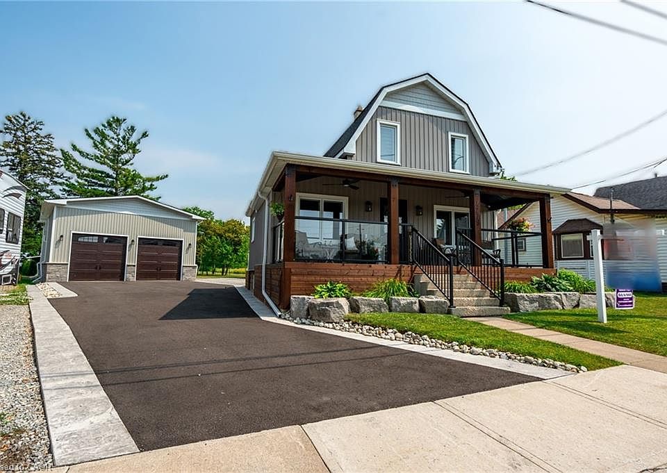 Step into this stunning, fully renovated two-storey modern farmhouse where timeless charm meets thoughtful upgrades. The heart of the home is a chef’s dream kitchen, boasting a gorgeous statement piece wood island countertop, stone backsplash, stainless steel appliances, and clever storage throughout. A functional dining and living spaces perfect for entertaining - all finished in fresh, neutral tones. Enjoy peace of mind with major upgrades completed: home security camera system, 200 amp panel, gas furnace and A/C (2020), windows (2020), roof (2021), bathroom vanities and shut-off toilets (2021), CO/smoke detectors in all bedrooms and halls (2022), and a rented hot water tank (2023). The basement was fully waterproofed in 2023, including a sump system and battery back-up. The exterior shines with a new concrete border and asphalt driveway (2025), and a 250 foot deep lot with a shed, fire pit, and entertaining space. The crown jewel is the detached pull-through garage, with oversized 10x10 bay doors with high lift tracks and wall mount openers. 16’ tall walls make it ideal for a car hoist or car stacker, forced air furnace and radiant heated floors, a versatile entertainment loft, featuring a gym, 3pc bathroom, kitchenette, and spacious rec area—ideal for hosting game nights or relaxing in style. This move-in ready home is a rare combination of quality craftsmanship, updated systems, and exceptional lifestyle potential. A must-see opportunity!