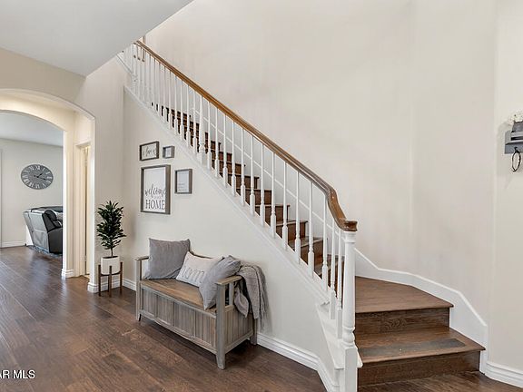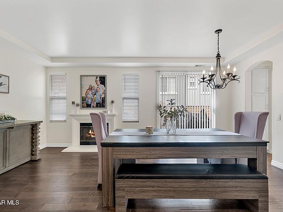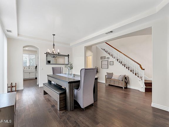 Welcome to this beautifully updated home offering 4 bedrooms, 2.5 baths, and a spacious bonus room perfect for everyday living. A soaring cathedral ceiling at the entry and gorgeous wood flooring throughout create a warm, inviting atmosphere. Thoughtful details such as designer paint, ceiling fans, and custom touches combine style with comfort. The formal dining room, highlighted by a chandelier and sliding doors to the side yard, flows seamlessly into the living room with a cozy fireplace. The gourmet kitchen showcases an extended center island, elegant quartz counters, sleek white cabinetry, and a farmhouse sink - opening to the family room complete with a second fireplace, making it the ideal gathering spot. Upstairs, the primary suite offers a true retreat with dual closets featuring custom built-ins and a spa-inspired bathroom with dual vanities, soaking tub, and separate shower. Three additional bedrooms, a generous bonus room, and convenient upstairs laundry complete the second level. Enjoy the private backyard with picturesque mountain views, a covered patio, lush landscaping, and a spacious grassy area - perfect for entertaining or relaxing. A 3-car garage with built-in cabinets provides ample storage. Located in a prime neighborhood, close proximity to Sycamore Canyon K-8 School, parks and The Village. Exceptional!