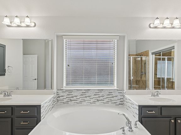 The spacious primary suite is a private retreat with a soaking tub, glass-enclosed shower, dual vanities, and a walk-in closet. Two secondary bedrooms are served by a full bathroom with a walk-in shower.