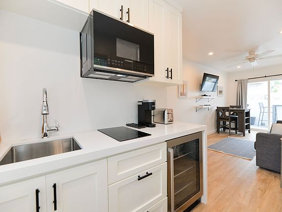 Black hardwareSleek kitchenetteMini fridgeNew flooringPrivate enclosed patioCeiling fanWalk-in shower