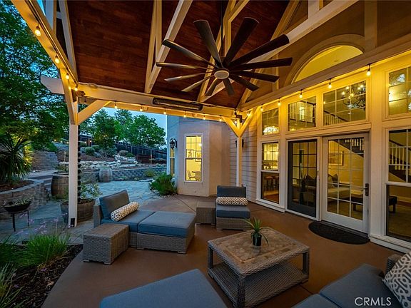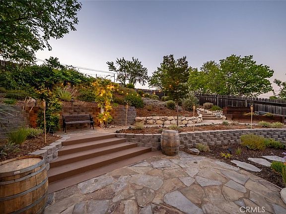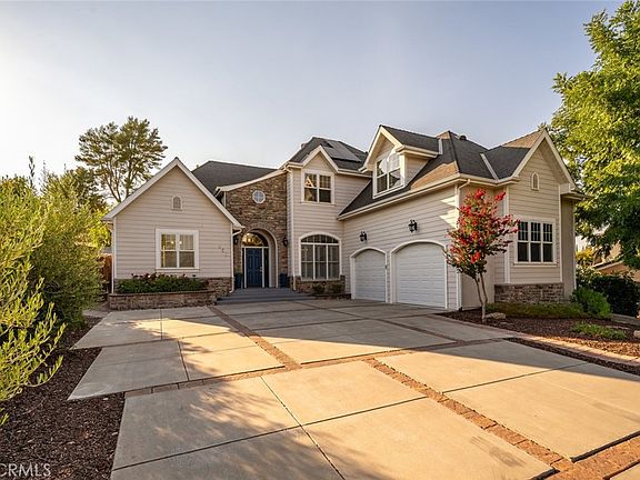 Impressive Westside beauty, just one mile from downtown Paso Robles! Perched on an elevated cul-de-sac in a beautifully landscaped one-third of an acre setting, this move-in ready, nearly 3,000 sf home delivers elegance and comfort at every turn. A cobblestone-accented driveway leads to a stunning interior with soaring ceilings, rich wood floors, oversized crown moldings, and Pella windows. The chef’s kitchen boasts a 48" commercial-style range, built-in refrigerator, matte leathered granite island, walk-in pantry, and abundant storage. The grand formal dining room sets the stage for memorable gatherings. The desirable floor plan includes a large main-level primary suite with a walk-in closet finished with built-in storage and a brand-new remodeled, spa-like bathroom. Upstairs offers two guest bedrooms, one ensuite, and a versatile media room or den (or fourth bedroom) with wet bar and generous hidden walk-through storage areas accessed by discreet doors. Outdoors, enjoy a sprawling covered patio outfitted with heaters, lighting, a ceiling fan, and breezy curtains—perfect for year-round entertaining. Beyond, you’ll find a fire pit, stone pathways, and an elevated view area ideal for evening sunsets, all surrounded by beautifully landscaped grounds with mature, drought-tolerant native plants. Equipped with solar panels and Tesla backup batteries, this home helps reduce monthly living costs while providing peace of mind with reliable backup power during an outage. Prime Westside location close to designer shops, upscale restaurants and bars, wine tasting, and the downtown park.