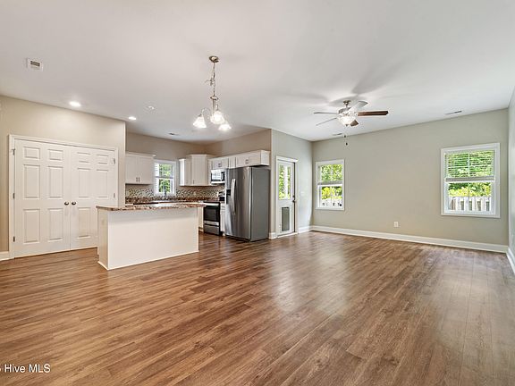 Welcome to 428 Ridgeway Drive in Sneads Ferry, NC - a beautiful 3-bedroom, 2-bath home offering modern finishes and coastal convenience. Step inside to a spacious open-concept living area highlighted by vaulted ceilings, creating an airy and inviting atmosphere perfect for everyday living and entertaining. The kitchen is the heart of the home, featuring white shaker-style cabinets, a stylish tile backsplash, stainless steel appliances, and a large center island with seating - ideal for meal prep and gatherings.