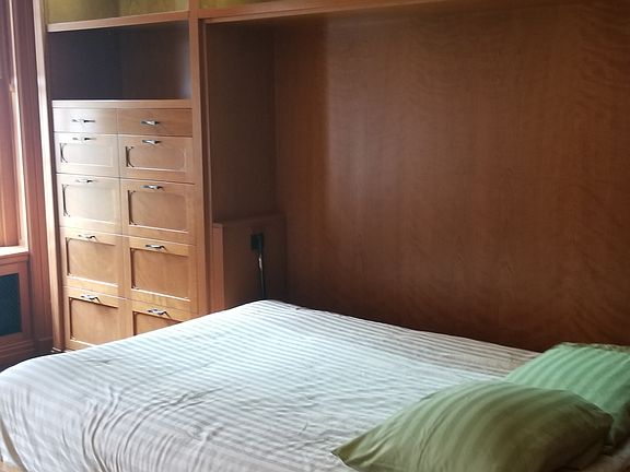 Italianate fireplaceExposed brick wallsContemporary styled bathSophisticated lightingDouble fold down bedHigh ceilingsBuilt in desk