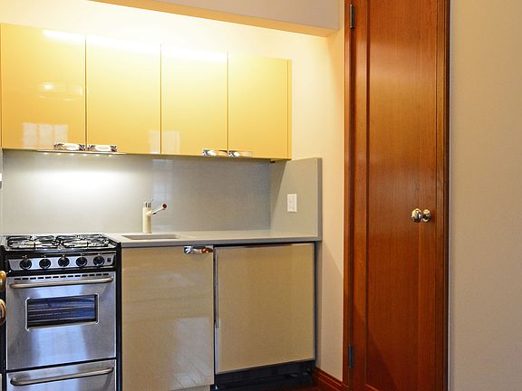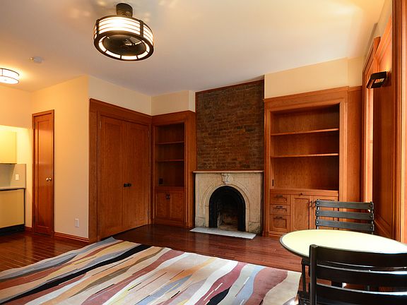 Located between Actors Studio and New Dramatists on tree lined West 44th, this historic 4 story brownstone offers a newly renovated 400 sq ft studio fully furnished. Sophisticated lighting, cherry library paneling, exposed brick walls, high ceilings, Italianate fireplace. Faces South with 3 large windows overlooking a sea of gardens. Fully applianced kitchen, contemporary styled bath. Furnishings include double fold down bed, sofa, bistro dining table, with 2 chairs, built in desk, built in highboy dresser, lighting, TV, linens and dishes. Walk to Broadway theatres and hundreds of restaurants., Hudson Yards is 10 blocks. Available through owner/broker. No fees, Wifi included in rent, standard application, credit check, references.