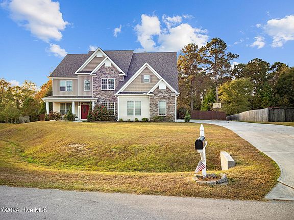 *** SELLER OFFERING $15,000 USE AS YOU CHOOSE!!!!*****This meticulously maintained home is nestled in the ever so popular, Peytons Ridge. Located on over an acre lot in a cul-de sac. As you enter the foyer, you will immediately notice the custom details of this pristine home. This home boasts lots of natural lighting through out. The kitchen is equipped tile backsplash, a gas stove with vent and stainless steel appliances. The wall oven and expansive cabinet and countertop space will excite any cook and make cooking a breeze. As you make your way to the family room take note of the built-in bookshelves and electric fireplace. This really a great place to make memories! The open layout of the family room, kitchen and breakfast nook creates a focal point for gatherings. Upstairs, take note of the spacious recreation area at the top of the stairs and the 4 generous sized bedrooms. Need a little rest and relaxation? Retreat to the master suit which has its own sitting area and spa-like bathroom. Enjoy those Coastal Carolina evenings out back in the covered patio or host all the outdoor fun in the large fenced in backyard. Conveniently located to local shopping, restaurants, crystal coast beaches and military bases. This gorgeous abode won't last long!