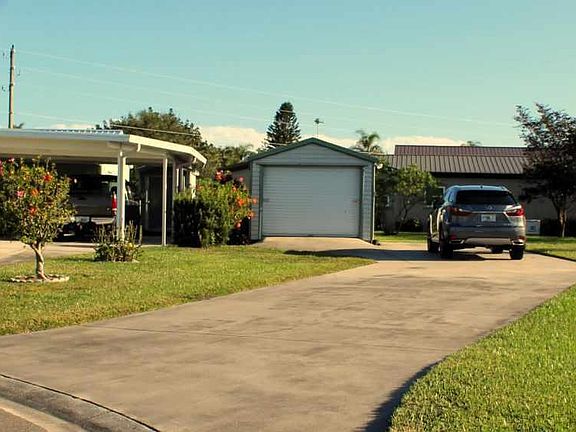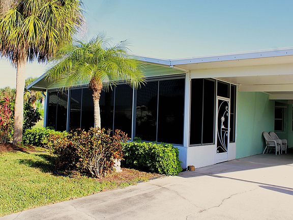 Beautifully maintained 3 Bed 2 bath home in desired 55+community of Palm Village Ranch.This home has added hurricane protection with solid concrete, floors, walls and roof with a metal roof. Screened front porch with ceiling fans to relax and enjoy the outdoors. Tile through out home. Spacious large kitchen over looking living room with a eat at bar. Seperate formal dining area. Large living room with sliding glass doors leading to the patio. Large master bedroom with huge walk in closet, double doors lead to the master bath with a garden tub and step in shower. Seperate indoor laundry room. House is equipped with generator plug in as well. Outside beautifully maintained yard,huge outdoor covered carport, 2 sheds, double lot, with seperate driveway. Located minutes to the Lake