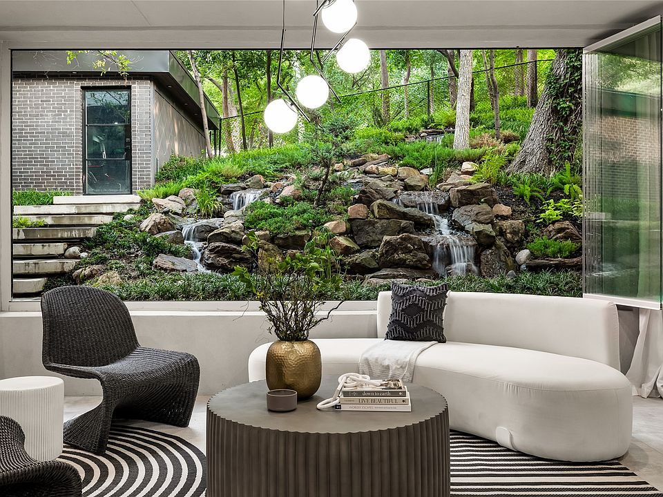 Architectural masterpiece in what feels like a secluded, forested setting located in highly desired area of Bluffview in the heart of Dallas. Tucked beneath a lush canopy of mature trees in one of Dallas’ most coveted neighborhoods, this reimagined modern estate is a masterclass in architectural serenity, design precision, and luxurious indoor-outdoor living. One of the most breathtaking and one-of-a-kind features of this home is the multi-tiered, stone-lined waterfall that cascades down over 100ft of moving waterfalls and streams. Designed to echo a natural mountain spring, this custom water feature is more than ornamental, it's a tranquil centerpiece visible from nearly every angle of the main living spaces. The gourmet kitchen is a chef’s dream with top-tier appliances, striking black and brass finishes, and built in fridge. Head upstairs to the primary bedroom suite with vaulted wood ceilings and an ensuite bathroom to die for. Enjoy the sculptural soaking tub, steam shower with rainfall shower head, dual vanities, a custom walk in closet with a large island and extensive storage. This one of a kind 5 bedroom 4 and half bath home is perfect those who want to escape the Dallas rush but still remain in the heart of Dallas.