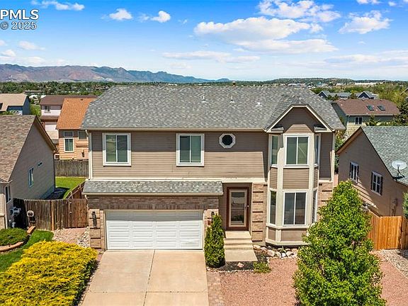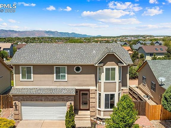 ***Buy with confidence a Brand NEW roof installed July 22 2025!*** Welcome home to soaring 22’ vaulted ceilings and breathtaking views of Pikes Peak! This thoughtfully designed home offers an ideal blend of comfort and functionality across three levels. The main floor is perfect for entertaining, with a bright and open living room, dining area, and kitchen that walks out to a freshly painted spacious deck—ideal for summer barbecues or enjoying mountain sunsets. The living room also features motorized blinds for added convenience and comfort. The kitchen boasts upgraded stainless steel appliances, a generous pantry, and a breakfast bar for casual meals. Upstairs, the primary suite offers an attached bath and beautiful mountain views. Two additional bedrooms, a full bathroom, and convenient upper-level laundry complete the floor. The finished basement includes a cozy family room, a fourth bedroom, and a 3/4 bath—perfect for guests or a private retreat. Outside, enjoy a large backyard with plenty of space to play, garden, or relax, along with a newly installed sprinkler system to keep it all looking lush. Additional features include a radon mitigation system for peace of mind. Whether you're hosting indoors or outdoors, this home provides the space, upgrades, and setting to truly enjoy Colorado living.