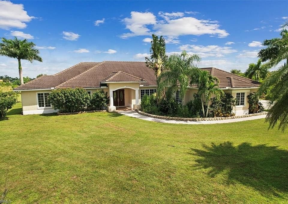 Private Estate Living with High-Tech Comfort on 3.87 Acres! Welcome to this Custom 4-bedroom + office, 2.5-bathroom estate home with 3,662 square feet under air, and 5,643 square feet under roof, nestled on a sprawling 3.87-acre fenced lot in Golden Gate Estates. Built in 2005 and meticulously maintained, this smart-enabled residence offers peace, privacy, and modern conveniences with no HOA restrictions. From the moment you enter the royal palm-lined driveway and pass through the smart electric gate, you're greeted by beautifully manicured grounds, a secure perimeter fence, and mature fruit trees including mango, lychee, starfruit, olives, and more. Inside, you'll find an expansive split-bedroom floor plan featuring tile floors, Corian countertops, stainless steel appliances, walk-in pantry, and a formal dining room. The spacious primary suite offers his and hers walk-in closets and a luxurious spa-like bath with a jetted tub, oversized vanity, and separate shower. A standout feature is the reinforced concrete Safe Room—complete with its own kitchen, bathroom, and generator hookup—perfect for use as a secure 4th bedroom or storm-ready retreat. Additional highlights include: Concrete tile roof (new in 2019) – insurance-friendly! Smart home features: lighting, thermostats, garage doors, irrigation, and security, all controllable via smartphone Fiber internet, smart light switches, and smart irrigation system 3-car garage with a workshop equipped with built-in shelving Trane variable-speed A/C system (main + separate zone for west wing) Enormous 1,197 square feet screened in lanai with pool, hot tub, and enclosed equipment room Split floor plan offers privacy for guests or multigenerational living New pool motor (2024) for worry-free enjoyment Hurricane shutters + impact windows for safety and peace of mind Airy family and living rooms, dedicated office, and large laundry room Enclosed chicken coop, horse pen, and large detached shed with electric and water—perfect for toys, tools, or livestock Whether you're entertaining on the lanai, enjoying fruit from your trees, or relaxing in your hurricane-rated safe room, this home blends comfort, security, and rural elegance just minutes from shopping, dining, schools, and Big Corkscrew Island Regional Park. Your dream Florida estate is here—schedule your private showing today!