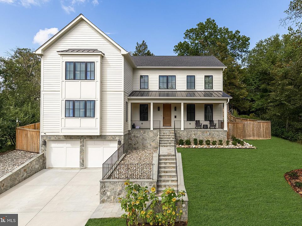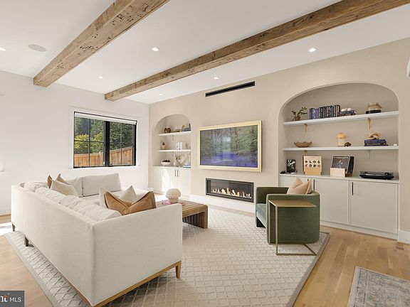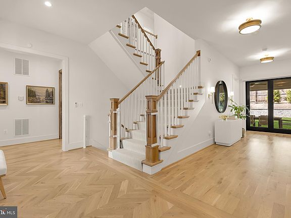 Tucked away on a quiet cul de sac in coveted Country Club Hills, 4283 38th Street North offers a rare blend of seclusion, sophistication, and striking design. Elevated above the street and framed by manicured landscaping, this custom residence was built in 2023 by CR Custom Homes and showcases where East Coast tradition meets West Coast style. The exterior merges the charm of a modernized Colonial with warm farmhouse influences. Interiors, curated by Santa Monica designer Tracy Gilmore, embrace a refined Southern California aesthetic. A broad stone staircase framed by tiered retaining walls leads to a welcoming front porch, setting the stage for elegance inside. A dramatic foyer, filled with natural light, spans the main level and highlights exceptional craftsmanship: wide plank white oak floors in herringbone, ten foot ceilings, eight foot quadruple hinged doors, Phillip Jeffries wallpaper, and motorized window treatments. Off the entry, a private study balances a main level bedroom suite ideal for guests or multigenerational living. The formal dining room, introduced by a refined vestibule, features a large bay window and connects via a butler’s pantry to the kitchen. At the center of the home, the kitchen is both showpiece and gathering space. Carrara marble wraps perimeter counters and backsplash, while a black leathered marble island adds contrast. Stacked inset cabinetry conceals appliances for a clean, modern look. An adjacent dining area and spacious family room flow seamlessly, with reclaimed wood beams, a linear fireplace, and arched built ins enhancing the atmosphere. The primary suite occupies its own upper level wing. A vestibule introduces the serene bedroom, while a second leads to a boutique style dressing room with custom shelving. The spa inspired bath includes radiant heated floors, a walk in shower room, double vanity, and separate water closet. At the top of the stairs, a loft creates a cozy reading nook and connects to three additional ensuite bedrooms with custom walk ins. A bold laundry room with patterned tile completes the level. The lower level includes a fifth bedroom suite, a large recreation room, and a mudroom accessing the two car garage. The backyard is fully fenced and landscaped, with open lawn, hardscape, and mature greenery. A covered rear porch with retractable screens provides seamless indoor outdoor living for year round dining and relaxation. Modern systems elevate efficiency and comfort, including impact rated windows and doors, backup generator, tankless water heater, integrated Sonos, comprehensive security, and extensive drainage infrastructure. Located just a mile from Chain Bridge and moments from Glebe Road Park, the home offers easy access to city amenities and natural beauty alike. 4283 38th Street North is more than a home. It is a masterclass in design, comfort, and function. Every finish has been thoughtfully selected. This is luxury living at its finest.