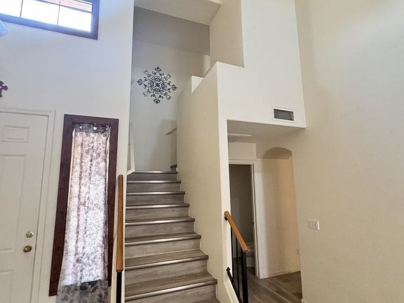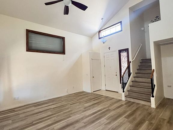 Move in ready with fresh paint throughout, vinyl plank flooring (no carpet) with large great room, formal dining, kitchen with breakfast bar, tons of counter and cabinet space and fridge, dishwasher, oven range. Half bath downstairs. Laundry closet off kitchen with washer/dryer hookups. 3 bedrooms upstairs with guest bath and spacious primary suite with walk in closet and en suite bathroom with separate shower and soaking tub, double sinks and extra large vanity. Covered patio and huge backyard. 2 car attached garage. Located in Ashley Heights with community playgrounds and parks.