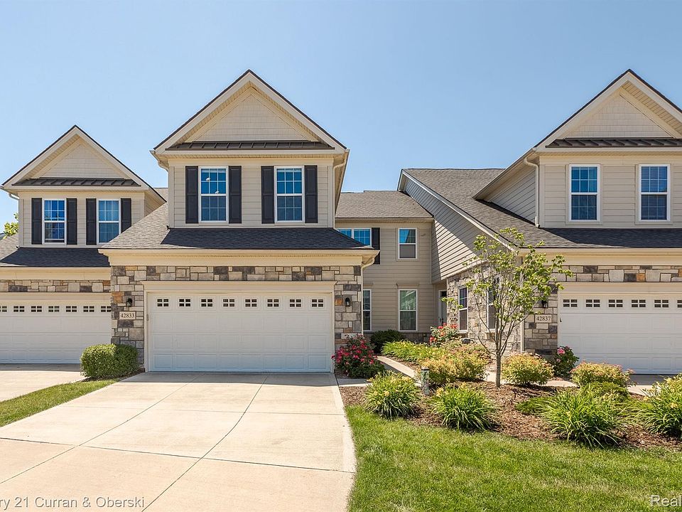 Impeccably maintained, like new built in 2017, Ridgeview of Novi condo. Rare find because 4 bedrooms! Wood floors throughout first floor. First floor primary with upgraded bath with quartz and euro door. Upgraded cabinets in kitchen with quartz counters and modified open concept kitchen. 4 zone in ceiling speakers with Sonos System included in sale. Framed TV in dining room negotiable. Upgraded high efficient furnace, Cat 6 cable T/O. Unfinished daylight basement with bath rough-ins, maintenance free deck with pondview! Great room with cathedral ceiling and has fireplace open to kitchen. Loft area (14x22) and family room is perfect for kids! 2 car attached garage with epoxy floor (2019) This condo has it all!