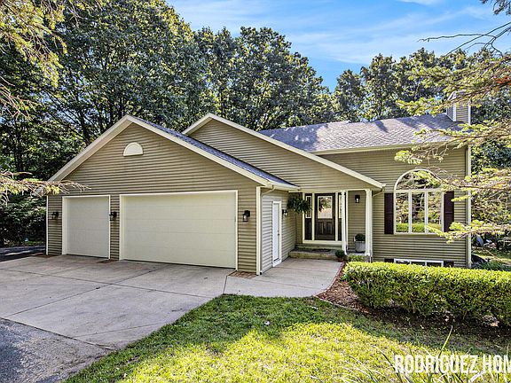 Welcome to this custom-built, 4-bedroom, 3-full bath home on 1.88 acres. Nestled on a quiet private drive just minutes from Knapp's Corner and downtown Grand Rapids this home has so much to offer! The main floor is filled with natural light and features beautiful hardwood floors, an open-concept layout, vaulted ceilings, and a cozy gas fireplace in the living room. The chef's kitchen boasts a large island, newer stainless steel appliances, a pantry, and a convenient option for main floor laundry. The spacious primary suite offers quartz counters, dual sinks, a soaking tub with separate shower, and ample closet space. Upstairs, two large bedrooms with vaulted ceilings, and a loft area/flex space provide added charm. The walkout basement includes a rec room, bedroom, full bath, walk-in pantry, and generous storage. Part of the yard is fully fenced. Newer mechanicals (furnace, AC, water heater). The oversized 3-car garage offers hot/cold water connections, drains, and 220 connection. This home is a must see! Call to schedule a showing!
