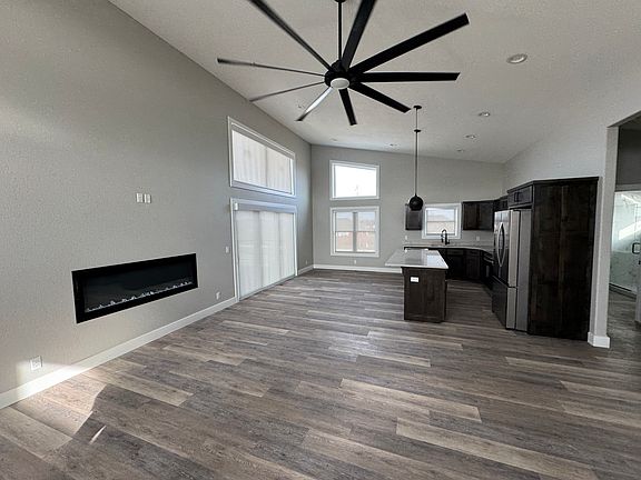 Relaxing Features: Enjoy the ambiance of a modern, built-in electric fireplace in the living area and a sleek, extra-large ceiling fan.