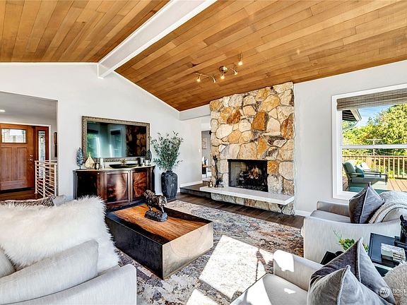 This stunning North end residence was meticulously remodeled from top to bottom. Situated at the top of a private drive, this home enjoys natural beauty all around, with Lake Washington and Mt. Rainier views, as well as a tranquil, sylvan setting. An open great room floor plan w/vaulted ceilings, walls of glass, hardwood floors, RH light fixtures. Two large & luxurious primary suites + 2 BDs & den. The true magic of this property lies in its exceptional outdoor spaces. Covered & heated areas call you to savor the outdoors throughout the seasons. Gather around the cozy gas fire pits or watch your favorite shows on the outdoor TV. The fully fenced, secure yard is a private haven, complete w/landscaped terraced gardens and secure play yard.