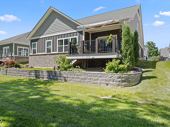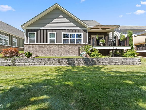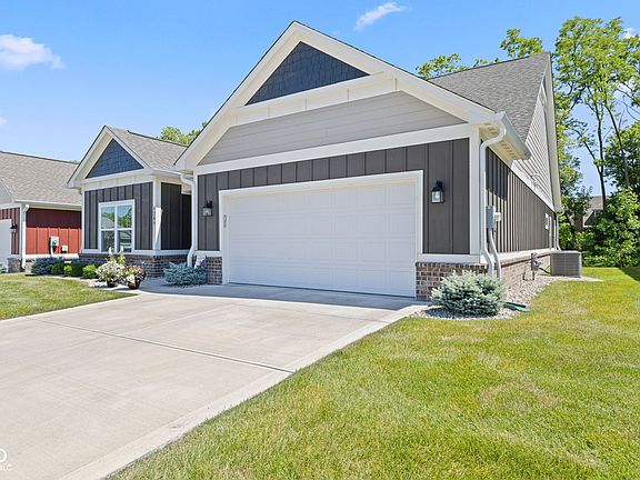 Featuring The Harrison floor plan & the envy of the neighborhood! This detached single family home has just over 2400 sq ft with 3 bedrooms and 3 full baths and is absolutely stunning! The thoughtful design includes an open floor plan, sizable great room, 3 spacious bedrooms, breakfast room, flex room on the main level, center island w/granite counters, shaker style cabinets, 9' ceilings, a finished upstairs bonus room, and bedroom w/full bath, & more! Some additional extras/features to note include: an outdoor oasis with a fantastic view complete with a stone retaining wall, water feature & fountain, Trex deck, and SunSeeker awning. Inside you will find custom wainscoting, wood beams in the great room and primary bedroom, tray ceiling in the office and primary bedroom, roll-in shower with 3 shower heads, epoxy garage floor, & a garage storage system all included! The maintenance free community offers a clubhouse with a fitness center, full on-site kitchen, gathering room, and in ground pool. You are just a short walk or golf cart ride away to the town of New Palestine where you can enjoy outdoor festivities year round (Depot Street summer, fall, and winter festivals) or grab an ice cream from Frosty Boy or a coffee at Barrel Racing Baristas!