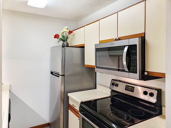 The kitchen includes dishwasher, garbage disposal, electric oven, under cabinet lighting, built-in microwave, and refrigerator/freezer. There's a dining area off of the kitchen with space for a dining table and chairs.