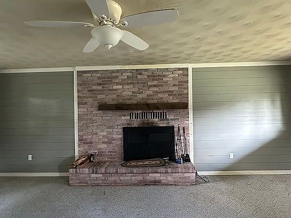 A basement rec room with new carpet and a fireplace — perfect for a family room, game space, or entertaining.