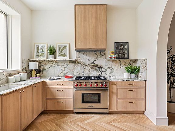 The owner’s three-bedroom, two-and-a-half-bath duplex opens into a gracious foyer and leads to a sun-filled parlor level with soaring ceilings, wide-plank white oak floors, and an open, flowing layout ideal for modern living. The living and dining areas are anchored by a stunning chef’s kitchen outfitted with custom cabinetry, marble countertops, a Fisher & Paykel integrated refrigerator, a six-burner Wolf range, an integrated dishwasher, and a microwave drawer. Massive windows overlook the rear deck and lush backyard, creating a perfect indoor-outdoor connection.