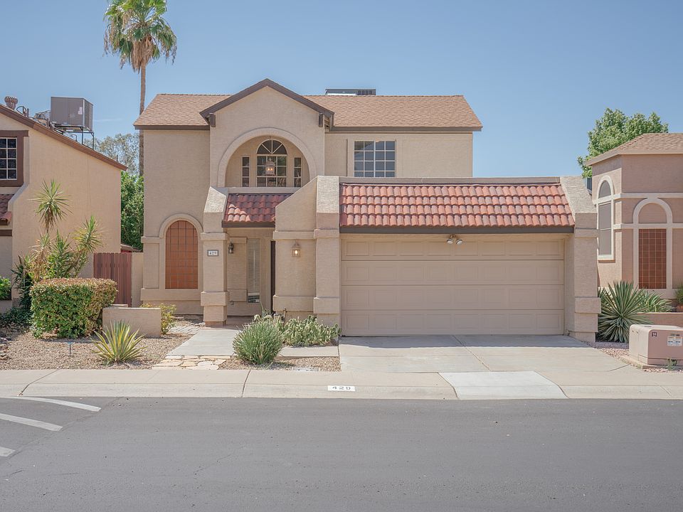 Upon entering this two-story Phoenix home you will note soaring ceilings and tile flooring. The eat-in kitchen boasts new stainless steel appliances and a pantry. The adjacent living room features natural lighting, a fireplace, and access to the backyard and pool. The downstairs Master bedroom offers a walk-in closet with built-in shelves and an ensuite bathroom with dual sinks and a step-in shower. Upstairs, you will see the secondary bedrooms and a full bathroom. Enjoy close proximity to recreation with nearby Adobe Dam Regional Park and Wet 'N' Wild! This home comes with a 30-day satisfaction guarantee and one-year premium warranty. Terms and conditions apply. Open House: Mon-Sun, 6am-9pm