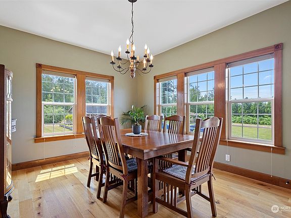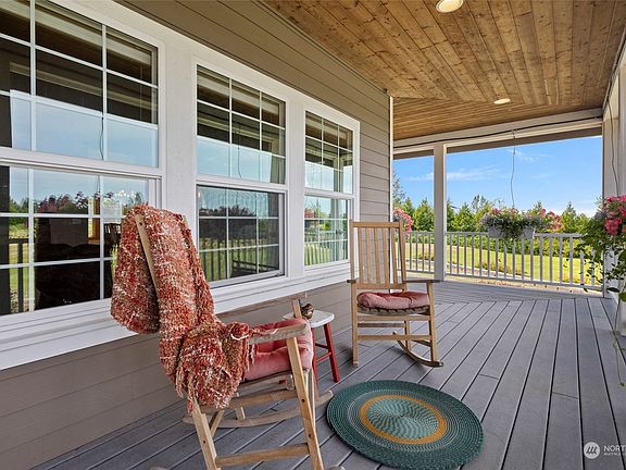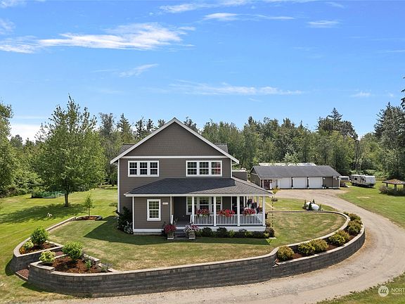 First time ever on the market, this custom home on 5 acres is a picturesque sanctuary. Nestled in nature, it features an expansive shop for 10 cars, a wrap-around porch with panoramic sunset views, multiple decks, and an extensive trail network on the back 3 acres. Whether you're an avid gardener, an outdoor enthusiast, or simply seeking a quiet retreat, this property has something for everyone. The grand 20 ft river rock fireplace stands as the home's centerpiece, exuding warmth and rustic charm. The thoughtful floor plan reveals a Chef's kitchen and massive gathering room downstairs, with custom wood detailing at every turn. Experience a blend of tranquility and luxury in this exceptional home, offering a lifestyle waiting to be embraced.