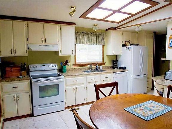 Welcome to 50+ living in this adult community designed with seniors in mind. This single wide mobile home with a generous addition creates a unique floor plan boasting a lovely living/ TV room overlooking the deck, a 4th bedroom (currently used as an office), and a generous foyer complete with large coat closet and ample seating to conveniently change footwear. The irregular shape of this front entry accommodates space to welcome several guests at one time. The original living room is now a semi-formal dining room, featuring a west facing large window, carpet flooring, and French doors to the adjacent living room. Glass partition walls either side of the entrance to the bright eat-in kitchen creates an open flow while delineating the space for furniture placement. The kitchen workspace is flooded with natural light from the skylight and window overlooking the deck. Other features include ample cupboard space , a built in China cabinet, and pantry with slide out shelving for convenience. Down the hall a step or two is the laundry/storage/mechanical room opposite the back door which accesses the generous deck. Here is an outdoor space for B-B-Q, summer suppers in a private space sheltered from northerly and westerly breezes, overlooking the fenced back yard. Back inside the entire south end of the home is the primary bedroom featuring a 3 piece ensuite. The walk-in shower there was created by "Bath Fitter" in 2020 replacing the original tub. Two good sized closets with mirrored doors complete this lovely retreat . At the north end of the home you will find 2 more bedrooms, a 4 piece bath with tub, large linen closet and a smaller utility closet for vacuum etc. This very well thought out floor plan clicks all the boxes for many couples.