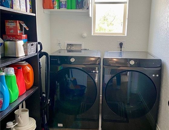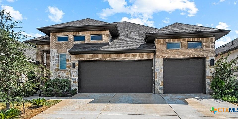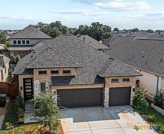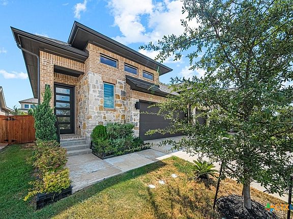 Perry Home in Veramendi Single-story - steps to trails and parks; fast access to Gruene and the Guadalupe. Modern architectural style with brick and stone exterior. Entry opens to high ceilings, well-lit with strategically placed oversized windows, custom shades that provide privacy yet let in the natural light. Garage, mudroom and laundry room all off of entry before opening up to beautiful and functional kitchen with large island seating for 4, 36" 5-burner gas GE Monogram cooktop, built-in oven and microwave, walk-in pantry with auto light when door opens, sleek granite counters, tile backsplash and plenty of cabinets. Upgraded kitchen lighting over island, dual color painted cabinets, under-mount large single sink with disposal. Kitchen opens to dining and family room with gas log fireplace and flows to the extended, tiled, covered patio that functions as a second living area. The owner has installed and nourished a beautiful, mature perennial garden the width of the yard and installed privacy fending. The primary bedroom and ensuite bathroom are large with room for a sitting area, double vanities, walk-in shower and garden tub, 2 walk-in closets, private toilet closet. Bedroom II has ensuite bathroom with walk-in shower, Bedrooms III and IV are split from the others and share a bathroom that has a tub-shower. Plenty of storage, no carpet, ring-camera at front door and 3-car garage has two doors with Wi-Fi enabled remotes, garage has 220 receptacles for power tools. The popular Veramendi planned community offers 10 miles of paved scenic trails, parks, greenspace and The Ledge - a large swimming pool with sun deck, splash pad, and interactive activities for kids. The Ledge includes pavillions, lounge areas, restrooms, a poolside kitchen with built-in grills.