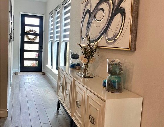 Gas log fireplaceBrick and stone exteriorSplash padHigh ceilingsOversized windowsCustom shadesSleek granite counters
