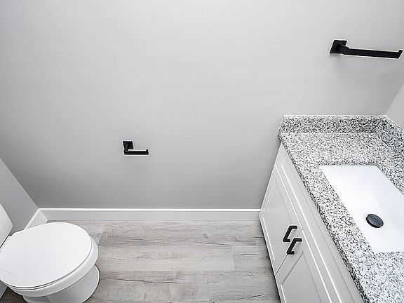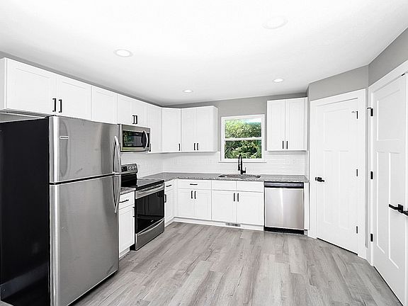Recessed lightingLuxury vinyl plankMatte black hardwareGranite countertopsDining areaStainless steel appliances