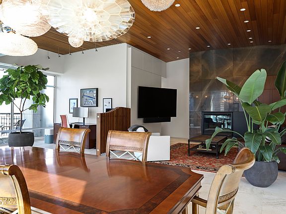In-wall gas fireplacePrimary suiteBreathtaking panoramic viewsDowntown viewsWalls of windowsWood ceilingsAbundant natural light
