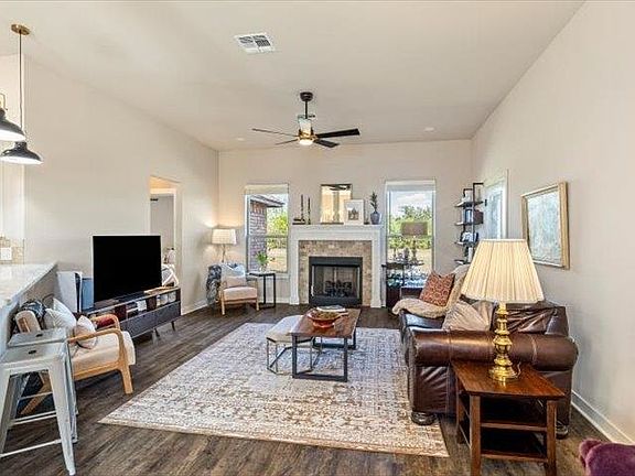 Better than new because this lovely home has been so well maintained! It is immaculate and ready for it's new owner! This home is located in the quiet Cache addition of Mountain View Meadows. It features an open floor plan with the kitchen, dining and living areas separated only by the kitchen breakfast bar. The kitchen has tons of storage with an island and a pantry. The cabinets are shaker-style and painted white accented by brushed bronze handles and white granite counter tops. The gorgeous counter tops and cabinetry are carried through to the baths with the primary bath featuring a double-sink vanity, large whirlpool tub, over-sized shower with light gray subway tile walls, and a walk-in closet that connects to the laundry room. The laundry room has a folding counter and extra storage. The guest bath is located on the opposite side of the living area and features matching finishes to the other bath, with a beautiful accent mirror and white granite counter tops, the gray subway tile and hexagon-shaped accent tiles in the product cubby. Both baths feature separately controlled heat to warm you up on cool mornings! The bedrooms are spacious and all feature nice-sized closets. The living area features a gas fireplace, vinyl plank flooring, recessed lighting and easy access to the covered patio. The yard is large and flat. You can enjoy watching wildlife in the tree area behind the home right from your patio. The light fixtures in this home are the modern brushed bronze and add a touch of elegance to the home. There is amply storage in this home with nice-sized closets, a wall full of cabinetry in the guest bedroom hallway, a pantry, a kitchen island and extra cabinetry in the laundry room. Call Kim Thomas today to view this lovely home, 580-704-9916.