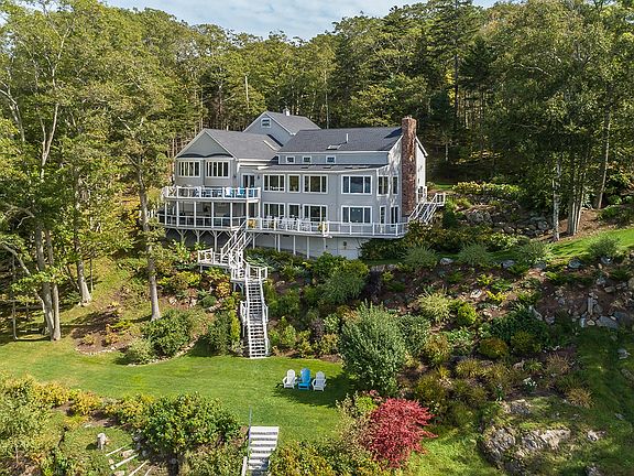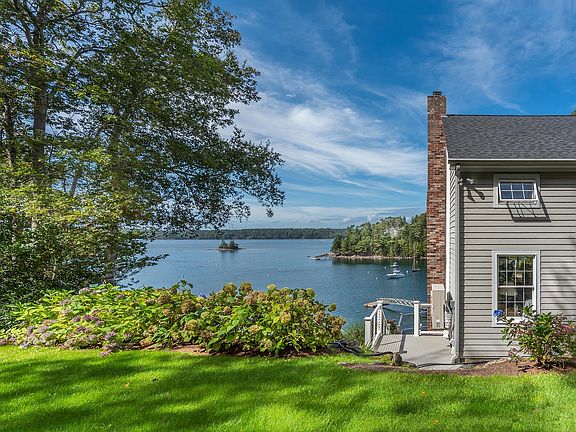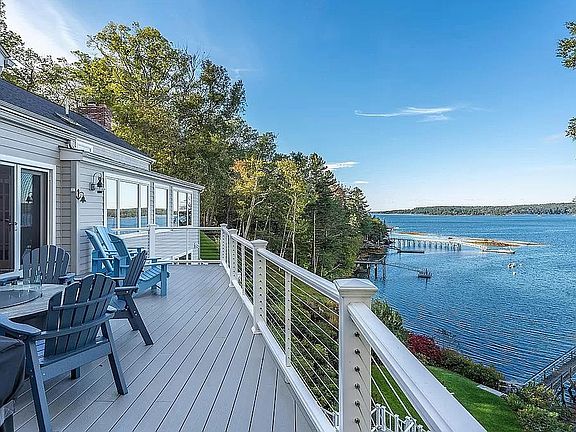 Situated in East Boothbay with stunning westerly views of Linekin Bay, this spectacular oceanfont home offers luxurious coastal living at its best. With a private deepwater ramp and float, as well as a private mooring, this property is perfect for anyone looking for a turn-key home with outstanding boating opportunities right out your front door. The fully furnished four-bedroom home features high-end amenities like Brazilian cherry floors, terraced lawn, and multi-level decks. Designed for group gatherings, it also offers quiet spaces for work. The great room boasts a quartz fireplace, 85-inch TV, Sonos surround sound, and a glass table overlooking the bay. The cozy living room and private office cater to relaxation and work needs. The pub room downstairs provides entertainment with a pool table, exercise equipment, and a wine bar. The gourmet kitchen is equipped with chef's grade appliances and a banquet-style dining table for 10. The primary bedroom includes a walk-in closet and en-suite bathroom with a jetted tub, and a large laundry room. The multi levl outdoor decks are furnished with a gas grill and fire table, and offer both covered and uncovered seating areas. Kayak or boat in Linekin Bay from the dock. Additional amenities include internet access available, beautifully landscaped grounds with irrigation, a Tesla solar array which produces more than enough electricity to power the whole house including heat pumps and an EV car charger in the attached two car garage. There is also a standby automatic generator. Conveys fully furnished and ready for your summer enjoyment.