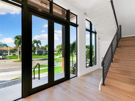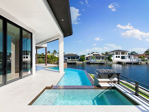 This brand-new, magnificent custom-built home offers luxurious waterfront living with four bedrooms and four and a half bathrooms. Situated on an exceptional oversized tip lot with 163 feet of waterfront, the property boasts breathtaking intersecting wide-water canal views. It is conveniently located just a short boat ride from Roberts Bay and the Gulf. Modern Contemporary Design, this spectacular two-story residence encompasses over 4,400 square feet of air-conditioned living space. Upon entry, you are welcomed by a spacious open-concept great room featuring beautiful custom built-in cabinetry. This area seamlessly connects to a chef's dream kitchen, equipped with a large island and breakfast bar, a gas cooktop, stunning custom cabinets, and a wine cooler. The first floor includes a ½ pool bath, and luxurious primary suite retreat, providing comfort and privacy. In addition, a guest ensuite is conveniently located on this level for visiting friends or family. Upstairs, you will find two additional en-suite bedrooms, each offering privacy and comfort. A wet bar with a wine cooler enhances the entertainment options, while the private covered open lanai, sun deck, and comfortable family room provide ample space for relaxation and gathering with loved ones. The expansive open outdoor living area features a sparkling pool, spa, and built-in gas grill, making it perfect for entertaining or unwinding in the beautiful surroundings. This home is equipped with impact-glass windows and doors throughout, ensuring safety and energy efficiency. Additional amenities include engineered wood & tile floors throughout, two air conditioning units, two tankless hot water tanks, a 500-gallon propane gas tank, and a transfer switch installed for a generator. Newer seawall, installed in 2009. Do not miss this opportunity to own this stunning waterfront custom home, where luxury and comfort meet exceptional design and location.