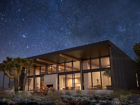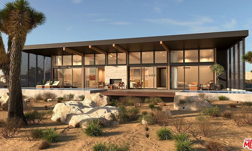 Pre-sale opportunity with an expected completion date of Winter 2026. Experience the perfect blend of modern luxury and desert serenity just minutes from the breathtaking landscapes of Joshua Tree National Park. This stunning new home with a detached ADU sits on 2.3 expansive acres, offering uninterrupted panoramic views of the peaceful surroundings, including head-on views of Goat Mountain. The property features a main residence with two bedrooms and two bathrooms, designed for seamless indoor-outdoor living. Soaring 16-foot ceilings and floor-to-ceiling glass walls create an airy, open atmosphere that brings the beauty of the desert inside. The sleek chef's kitchen boasts premium oak cabinetry and Caesarstone countertops, offering both style and functionality. A 700 sq. ft. detached ADU provides additional living space, perfect for guests, a home office, or an income-generating rental. A breezeway carport elegantly connects the two structures, offering shaded parking and architectural cohesion. Step outside and unwind in your private oasis, complete with a sparkling pool, a soothing spa, and a cozy fire pit perfect for stargazing and peaceful desert nights. Located close to La Copine, Pappy & Harriet's, and top off-road adventure spots, including Sand to Snow National Monument and King of the Hammers, this home offers a prime location for both relaxation and recreation. Don't miss this exclusive pre-sale opportunity to own a one-of-a-kind desert retreat this property also qualifies for Opportunity Zone benefits.