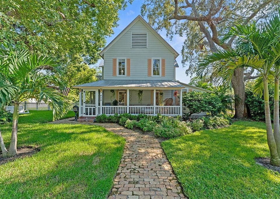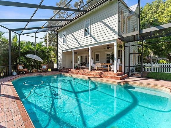 Imagine waking up every day in a home that feels like a storybook come to life. Built in 1900 and beautifully maintained, this iconic VICTORIAN FARMHOUSE sits proudly on a rare double lot totaling a half-acre on one of the most beloved streets in Historic Downtown Dunedin. The home is set back from the sidewalk, giving it a stately presence and a quiet, private feel. From the moment you arrive, the experience begins — the red brick walkway leads past a front yard shaded by beautiful mature trees (complete with a classic tree swing), inviting you to slow down, breathe in, and truly take in your surroundings. The wraparound screened porch feels like a step back in time, where mornings start with coffee and evenings end with the warm glow of lantern light and conversation. Inside, this home exudes character and charm with pristine original wood flooring, beadboard walls, original brick accents, antique door knobs, and even an antique toilet — saving time by keeping the main bath available for everyone else — all blending seamlessly with modern updates. Three solar tubes fill the interior with abundant natural light, giving the home a warm and airy feel throughout the day. With 4 bedrooms plus an office (or 5th bedroom), 3 remodeled bathrooms, and a spacious laundry room, this home is as functional as it is enchanting. The custom kitchen is a centerpiece, boasting a copper farmhouse sink, copper bar sink, quartz countertops, neutral cabinetry, pantry, natural gas stove, and newer appliances. The great-room-style kitchen and dining space is perfect for hosting large dinners — just open the French doors to let the party flow to the pool and lanai. Built-in speakers throughout the first floor let you set the mood in every space. The primary suite offers a peaceful retreat with a walk-in closet and a spa-like bath featuring a custom antique vanity, glass shower, and private water closet. Additional bedrooms are generous and light-filled, with a second bath offering dual pedestal sinks to match the home’s timeless aesthetic. This property has been thoughtfully updated with a newer dual-zone AC system with gas heat, upgraded electrical, hardwired smoke detectors, aluminum & Hardie board siding, vinyl fencing, pavers, and custom wood blinds — offering the best of both worlds: historical charm with today’s peace of mind. Out back, the magic continues with a screened-in pool and covered lanai with red brick pavers, surrounded by an extremely private fenced yard — an oasis in the heart of Downtown. There’s also a large outdoor closet for storage. The detached oversized 2-car garage was built to support a second story, making it ideal for a future guest suite, art studio, or office. There’s plenty of space for boats, RVs, and golf carts. Zoned MF 7.5, this property even allows for a conditional-use bed-and-breakfast (contact the City of Dunedin for details). Best of all, you’re right in the heart of everything — close enough to enjoy Douglas Street parades, with Tukro Coffee just around the corner, yet tucked away enough to feel secluded and peaceful. A short stroll or golf cart ride takes you to Downtown Dunedin’s shops, restaurants, breweries, festivals, and the Pinellas Trail. This isn’t just a home — it’s an experience, a lifestyle, and a rare opportunity to own a piece of Dunedin’s history on one of the most special lots in town.