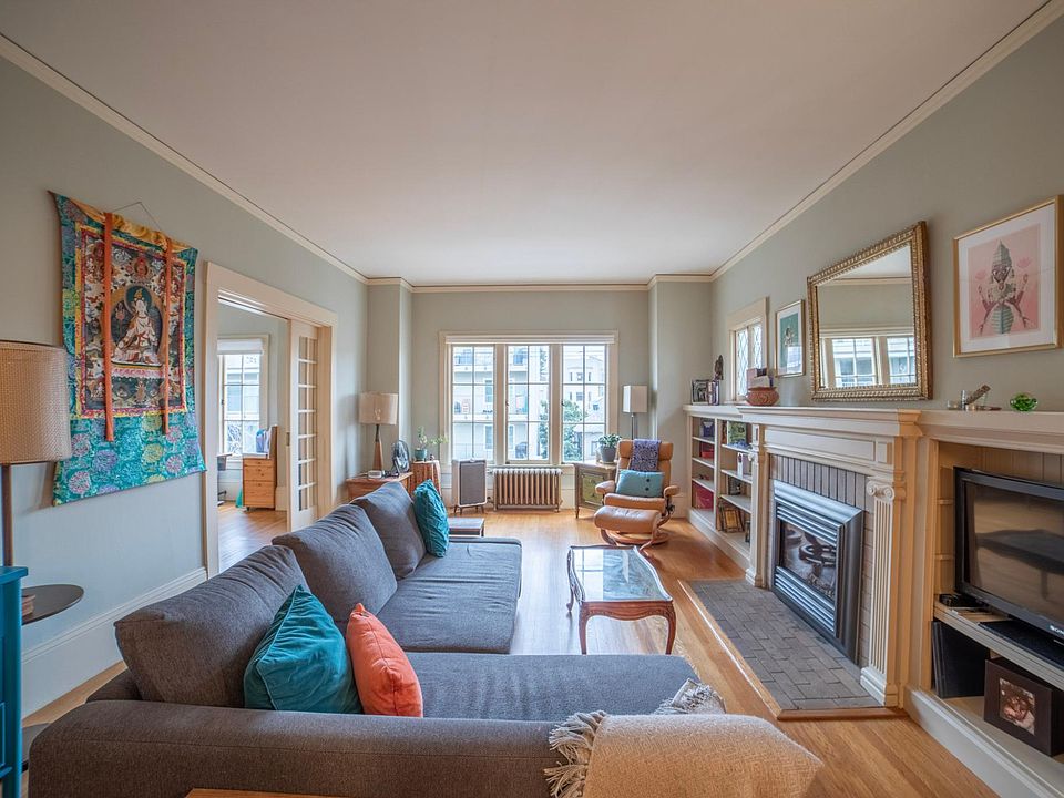 Unit is located in a three story, six unit, English Tudor design building in the heart of Adams Point. Unit has exceptional detailing! Kitchen was recently remodeled including cabinetry, stone counter tops with block glass back-splash, shaker style cabinetry, stainless steel appliances including new gas stove, Bosch dishwasher, refrigerator, and microwave. Bathroom has new vanity, fixtures and newly installed stone countertops.