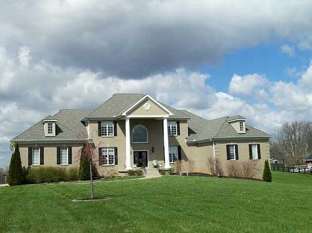 This absolutely exquisite home is PRICED TO SELL & awaits you on 5 glorious Shelby County acres. The 1.5 story brick, built by Scott Yates will WOW you the moment you enter the soaring foyer with its gently spiraling staircase & pristine floors.A glorious "Parlor" & Formal Dining Room welcome you. The breathtaking Great Room has 22' ceilings, gigantic windows, a lovely see-through fireplace & elegant woodwork. All of the Big Screen TV & Stereo equipment remains with the house.The spacious eat-in Kitchen is a cook's dream with a large, convenient Laundry close by.Down the hallway is a Fantastic Home Office/Library with a see-through Fireplace, incredibly appointed with rich wood bookshelves, walls & ceiling. This home has 2 possible Master Bedroooms on the 1st floor, both having high ceilings & huge windows. One has its own fireplace & both have elegant Bathrooms. Up the beautiful staircase are 2 more large Bedrooms, each with its own Bath. Full WALK-OUT Basement is unfinished, but could provide your family with 3500 sq. ft.more living space. An attached 3 Car side entry garage, a concrete driveway to the 50' x 48' 4 Stall Horse Barn & four board fence make the exterior of this home absolutely incredible!