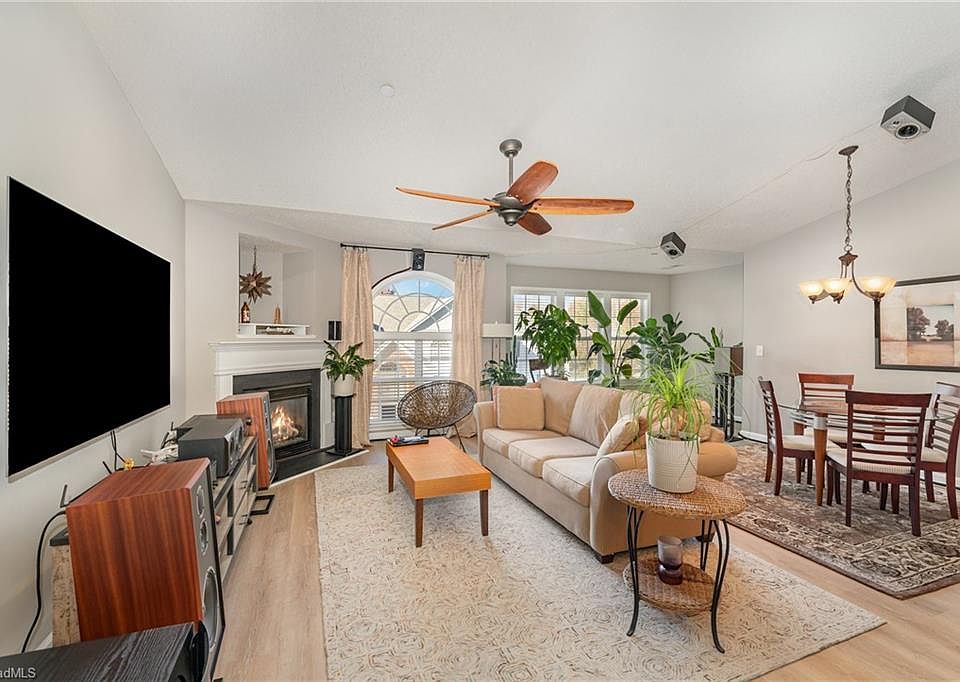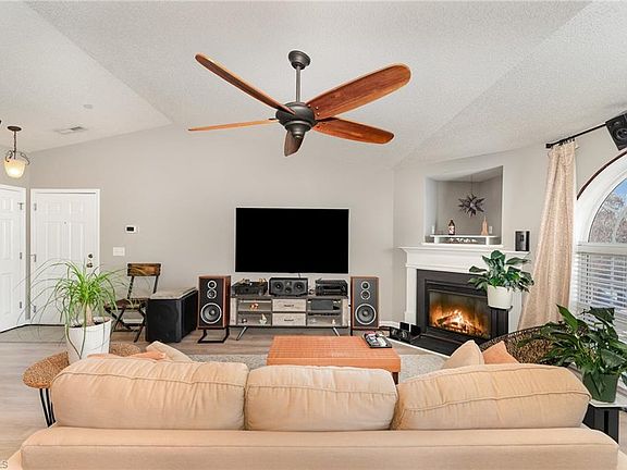 Corner fireplaceCathedral ceilingSunroom nookEfficient kitchenBeautiful newer appliancesWalking trailNice-sized primary suite