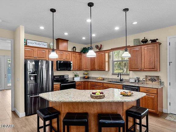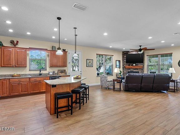 Welcome to your slice of paradise in Edgewater, FL! Nestled on 5.48 acres of lush greenery, this craftsman-style single-family home, built in 2019, offers a tranquil retreat from the hustle and bustle of city life. As you approach the property, you'll be greeted by an inviting open front porch, perfect for enjoying your morning coffee or watching the sunset. Step inside to discover a modern open floor concept, with 9-foot ceilings accentuating the spaciousness of the living area. The heart of the home features an electric fireplace, creating a cozy ambiance on cooler evenings. The well-appointed kitchen boasts sleek countertops, ample cabinetry, and stainless steel appliances, making it a chef's delight. With 2 bedrooms and 2 baths, including a primary bedroom with French doors leading to a private outdoor porch, this home offers comfortable living spaces designed for relaxation and rejuvenation. Convenience is key with a large indoor laundry room, ensuring laundry day is a breeze. Additionally, the home is thoughtfully elevated on a slab to prevent flooding, providing peace of mind during inclement weather. Surrounded by majestic oak trees and a serene lake (though not accessible to mainstream waterways by boat), this property offers a picturesque backdrop for outdoor enthusiasts and nature lovers alike. Don't miss your chance to own this exquisite retreat in the heart of Edgewater. Schedule a showing today and experience the beauty and serenity this home has to offer.