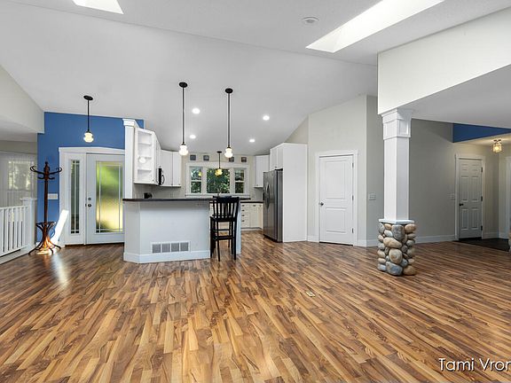 Rare find minutes from 96! This ranch sits on a private, wooded 4.5 acres with 5 stalls of garage AND room to build a pole barn! Notice the open floor plan, cathedral ceilings, skylights and huge windows that overlook the deck. Kitchen is open to the living room where stone pillars accent the eating area. Primary is nice size with a primary bath and a large walk-in closet. Main floor has one more bedroom, a 3/4 bath, main floor laundry and a mud room. Downstairs is a small kitchenette in the big family room, 2 more bedrooms, full bath, and you can't miss the attached enormous 3 stall under garage. Privacy, acreage, 20 minutes from GR, open floor plan and 5 stall garage---you won't see this again any time soon! Needs paint and carpet and it will be perfect! Seller exempt from taxes.