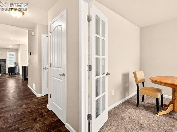 Welcome to low-maintenance living in the desirable Enclaves at Mountain Vista Ranch! This 2018 ranch-style patio home offers 3 bedrooms, 3 bathrooms, and over 2,300 sq. ft. of finished space, thoughtfully designed for both comfort and convenience. Step inside to an inviting open-concept main level featuring vaulted ceilings, abundant natural light, and a cozy gas log fireplace that anchors the living room. The kitchen blends style and functionality with a breakfast bar, granite countertops, stainless steel appliances, and plenty of cabinet space for storage. The spacious main-level primary suite offers a private retreat with a walk-in closet and an en-suite bath. An additional main-level office with French doors creates the perfect environment for remote work, a reading nook, or creative space. Downstairs, the finished basement expands your living options with a generous family room, a wet bar for entertaining, two additional bedrooms, a full bath, and an oversized utility/storage room. Outdoor living is just as enjoyable, with a private back patio ideal for relaxing mornings or evening gatherings and larger yard space. Residents also enjoy access to community walking trails, parks, and playgrounds—perfect for an active lifestyle. Located near shopping, dining, and District 49 schools, with quick access to Powers Blvd. and Marksheffel Rd., this move-in ready home combines modern finishes, a functional floor plan, and an unbeatable location.