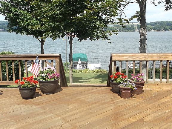 Spectacular lakefront living! 3 bedroom, 2 full bath (one on each floor), ranch home with finished basement/rec area - full double door walk-out to front lawn and lakefront. More deck space than you can imagine on both sides of the house and along the entire lake frontage with 3 aluminum docks. New furnace. Remodeled kitchen with new Bosch dishwasher & microwave, all appliances included. Newer roof, many windows, siding, concrete/stone walkway to house, central air, 8' Pella door to deck. Bow window in great room overlooks the lake. Perfect opportunity to own your dream home on the lake.